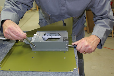 When I finally received the dimple dies, I dimpled the EIS module flanges and the side panel for the flat head screws. I checked the fit of the panel in the fuselage and had to enlarge the notch for the EIS harness coming from the firewall. I had originally planned to screw down the side panel before installing the transponder rack in the brackets, but after the test fit I realized that limited access required me to put the rack in the brackets first. In my haste, I almost put the rack in flipped, effectively masking the transponder's securing tabs... but I caught it in time. Getting to the screws inside the rack was tricky, which was the reason I chose flat head screws with a hex head instead of a Phillips or Torx head. I had to tape the Allen wrench to a long screwdriver to get it to the bottom two screws, but it wasn't as hard as I thought it might be. Once the rack was attached I could screw the side panel into the fuselage, hopefully to stay. I was worried that the rack would make it impossible to reach two of the floor screws, but with an angled screwdriver it was manageable if not awkward. I was actually surprised that installing the side panel turned out to be easier than bolting the EIS module to the side panel afterward. Because of the dimples in the panel and the flange I had to use progressively stacked washers to make sure the lock nut tightened the flat head screws fully into the dimples. On the bottom flange, working blind in a tight space, that turned out to be a real pain... especially because the harnesses had to be connected before the module was bolted down, and the tension of the flexing harnesses kept trying to pull the loose module off the screws. Just another jig in the jigsaw puzzle. When it was done, it felt like a major step forward, and it looked that way too.