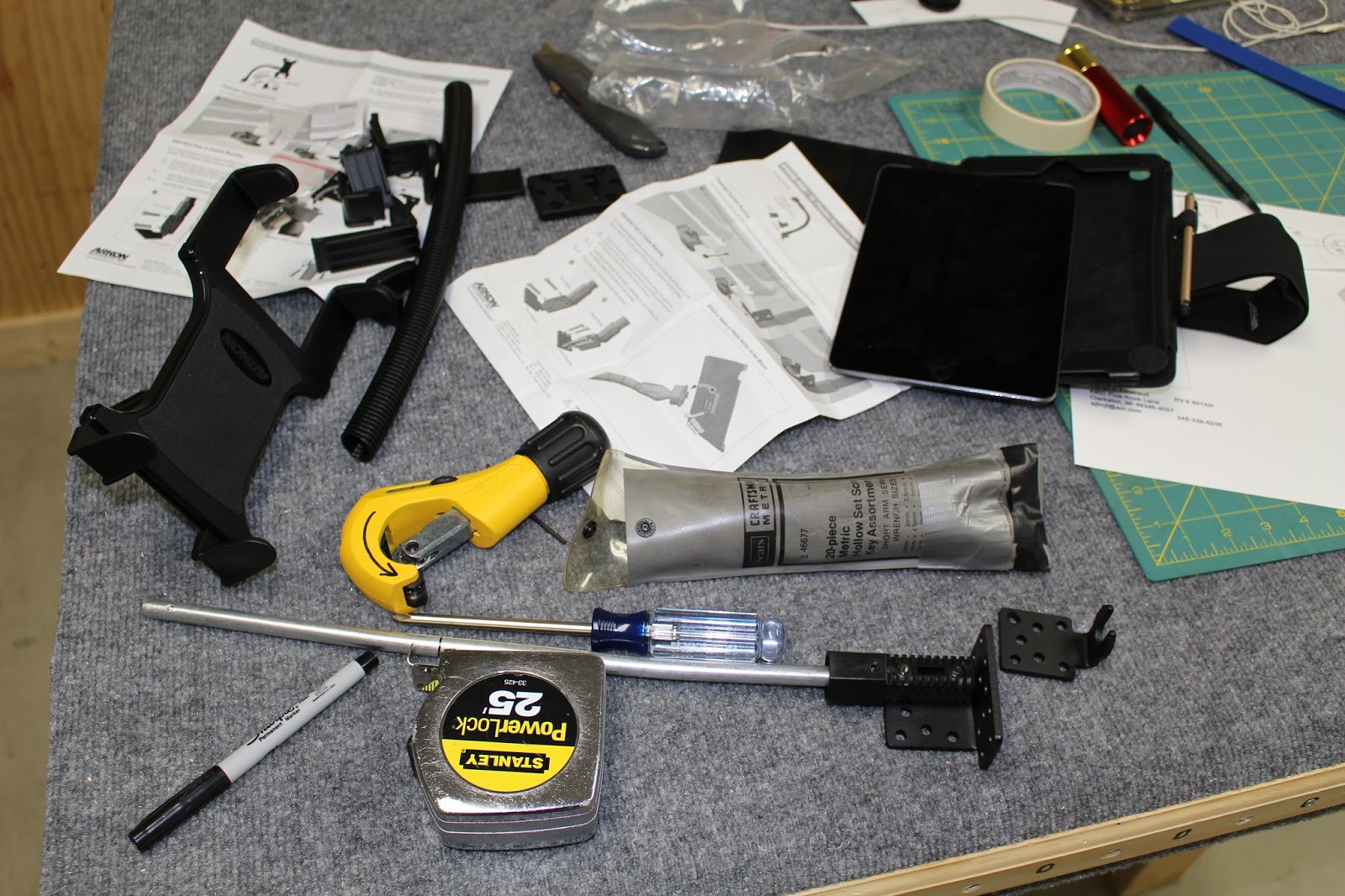 One cockpit accessory I knew I would need is an iPad holder and stand. I chose an Akon car stand and modified it to suit my needs. It took a while to decide the best way to install it, and I eventually chose to bolt it to the right mid cabin cover. This is a somewhat thin panel so I knew I would need at least a doubler plate and possibly some reinforcement angle to stiffen the panel. I made up the doubler plate out of aluminum sheet stock and used the stand bracket to match drill the screw holes in the doubler plate and mid cabin cover. I got cap screws, washers and lock nuts for the mounting bracket and had to modify the base of the pedestal for clearance. With everything temporarily assembled and in place in the cockpit, I was impressed. This should work well. It's exciting to be at this stage of cockpit assembly.