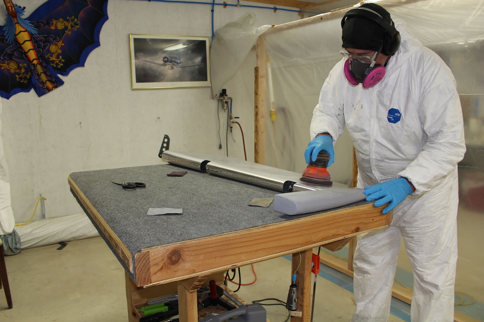 I'm making this post a little earlier than usual because the timing is right; as a result I'm hoping I can get it written quickly and get back to work. I continued my work on the horizontal stabilizer and elevator tips; smoothing, sanding, touching up and resanding. The parts were moved into the paint booth, along with the jigs. I clamped the horizontal stabilizer jig to the larger work platform and put the stabilizer into the jig to smooth the aft edges of the tips. Then it was masked and sprayed with filler/primer. I put extension boards on each of my small furniture dollies and attached them to the legs of the platform to make it easier to move around in the booth as needed. The left tip sanded out smoothly right away and was unmasked. The right side required a little more work so it was touched up and resprayed. The right elevator was reprimed and sanded. When I was happy with the result I brought the jig back over to the shop side and swapped in the left elevator for tip finishing; the right elevator was stored. When both stabilizer tips were smooth, I test-fit the right elevator and was happy with the result. The right elevator was put back in storage and the horizontal stabilizer was removed from the jig and hung on the stabilizer stand; the stabilizer jig and work platform were disassembled, removed and stored. Work continued on the left elevator tip.
