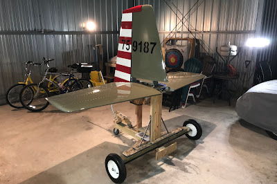 When the clear coats had cured enough to allow handing of the parts, the paint booth was dismantled and the fuselage brought from the garage side back over to the shop. The engine would fare better being stored in the heated shop during the winter and I will be able to continue working on the canopy and cowling. It was finally time to get some airplane parts to the hangar. The horizontal stabilizer needed to be transported in my trailer, so I screwed the stabilizer jig down to the floor of the trailer and placed the horizontal stabilizer in the jig, which seemed the most secure way of transporting it; no additional tie downs would be required. The stabilizer paint stand was also transported in the trailer, as it was too large to be hauled by the Yukon. Once the horizontal stabilizer was safely at the hangar it was removed along with the jig and stand; the trailer was detached and stored. The elevators, trim tab, rudder and vertical stabilizer were carefully wrapped and transported in the back of the Yukon, with the vertical stabilizer jig table and assorted parts and tools carried in the front passenger seat. Now that I had airplane parts at the hangar, it was time to start the conversion of the hangar from a storage space to a shop space. I built a workbench out of an old repurposed solid core door and some lumber. A 4'x8' plywood sheet was hung on a wall for use as a poster board; extension cords were run, power strips installed and additional lighting set up. I was eager to see if I could mount the finished empennage parts on the old empennage stand. That stand had been eyeball engineered for holding the stabilizers, rudder, elevators and trim tab once the tail kit had been completed. But that was prior to the mounting bracket being added to the front spar of the vertical stabilizer and the rudder bottom being added to the rudder. The wooden top saddle assembly I had designed to secure both stabilizers couldn't be used with the finished vertical stabilizer. I would also have to see where the aft spar saddle would place the vertical stabilizer in relation to the front spars of both stabilizers. As it turned out, the fit was much better than I had dared hope. Somehow, the fore/aft and side to side spacing were both perfect and the vertical spacing was only off by about 3/4". With the rear spar of the vertical stabilizer held by the aft spar saddle, all I had to do was sandwich the front spars between a small piece of plywood and a chunk of nylon and clamp the assembly tight with a large C-clamp. Drilling bolt holes in the plywood proved unnecessary. I did need to remove some material from the back of the aft spar saddle to make room for the rudder bottom, as I had on the jig table. But I was able to set up the entire empennage on the empennage stand; an ideal storage solution that would make the assembly easy to move around as needed.